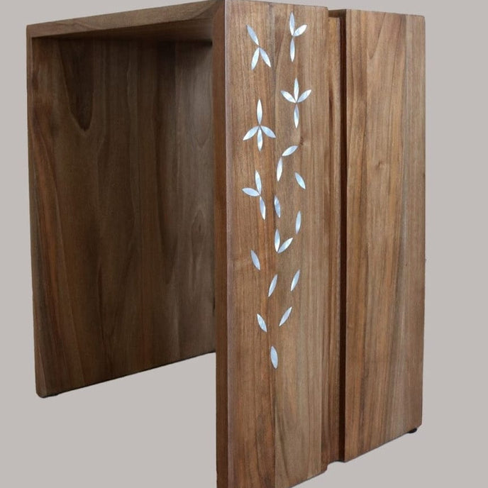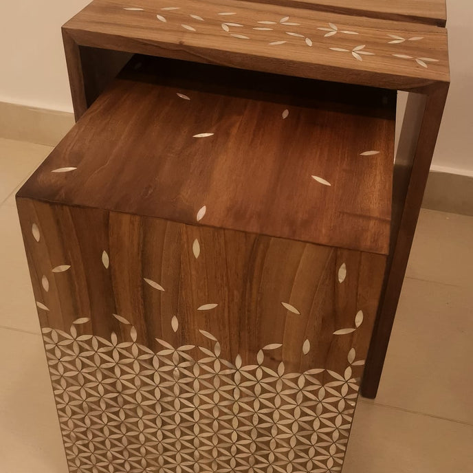 Expertly crafted, the Petals Tables set features a delicate pearl inlay of falling petals on a solid wood block. The result is a unique, elegant table that adds a touch of sophistication to any room. This table set is beautiful and functional with its intricate design and high-quality construction.