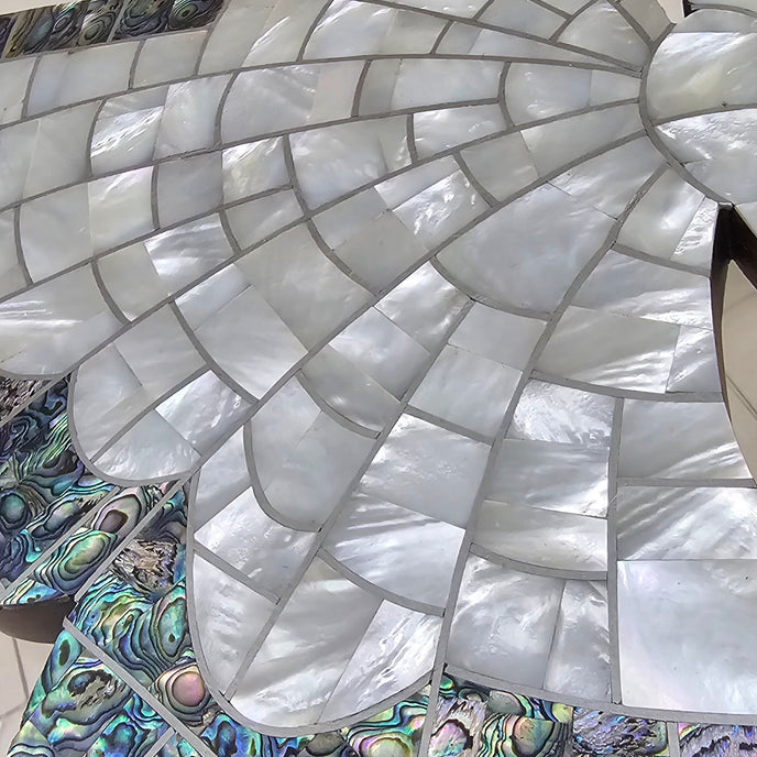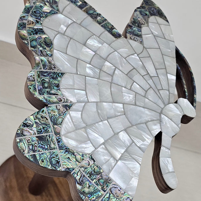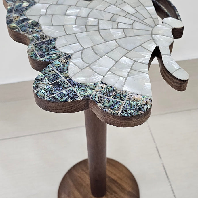 Hand-crafted pearl inlay and wooden stand create a stunning Butterfly - shaped surface, perfect for use as a side table or sofa table. Experience the beauty of nature in your home with this unique piece.