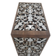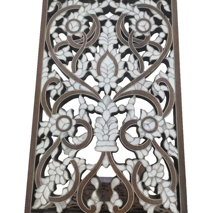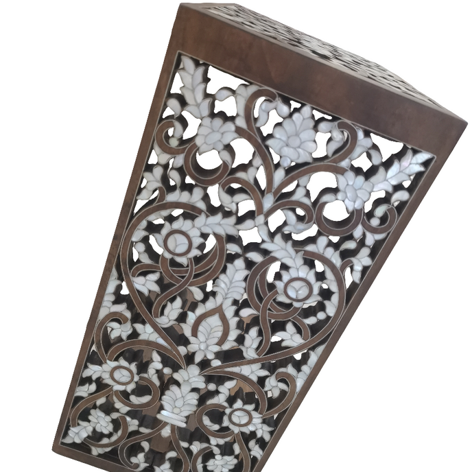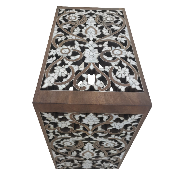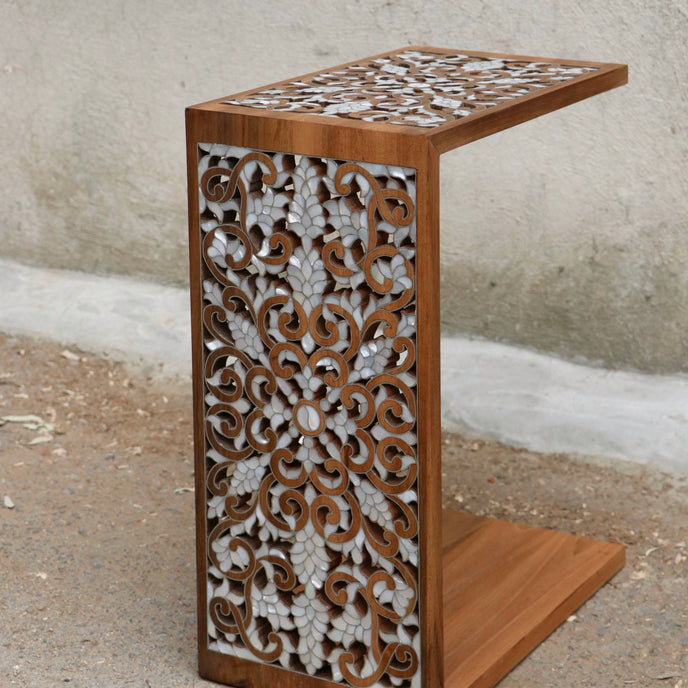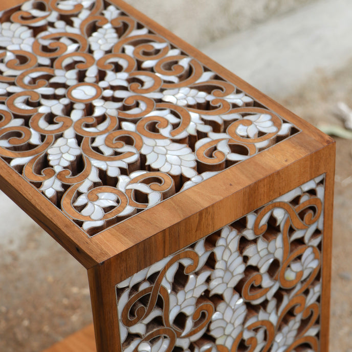 This handmade wooden sofa table features a beautiful pearl inlay, adding a touch of elegance to any living space. Crafted with precision and care, this table is not only a functional piece of furniture but also a stunning work of art. Enhance your home decor with this unique and expertly crafted piece.