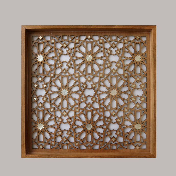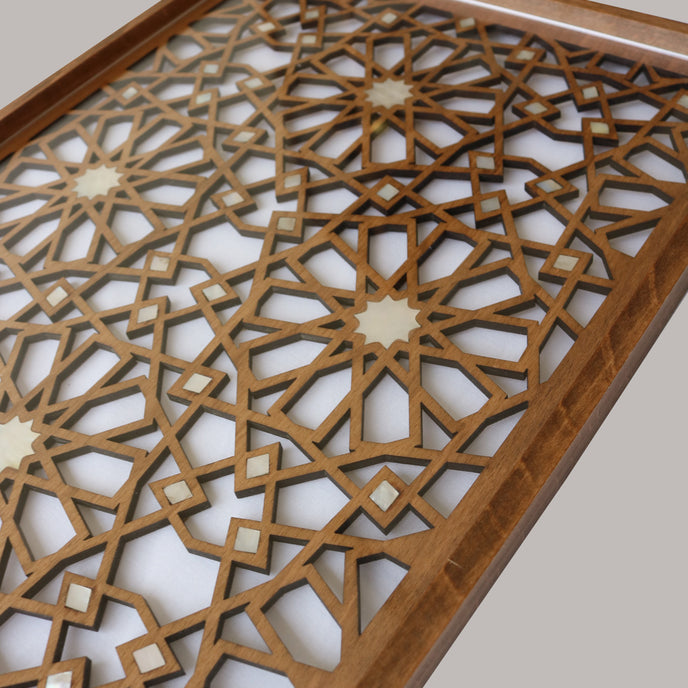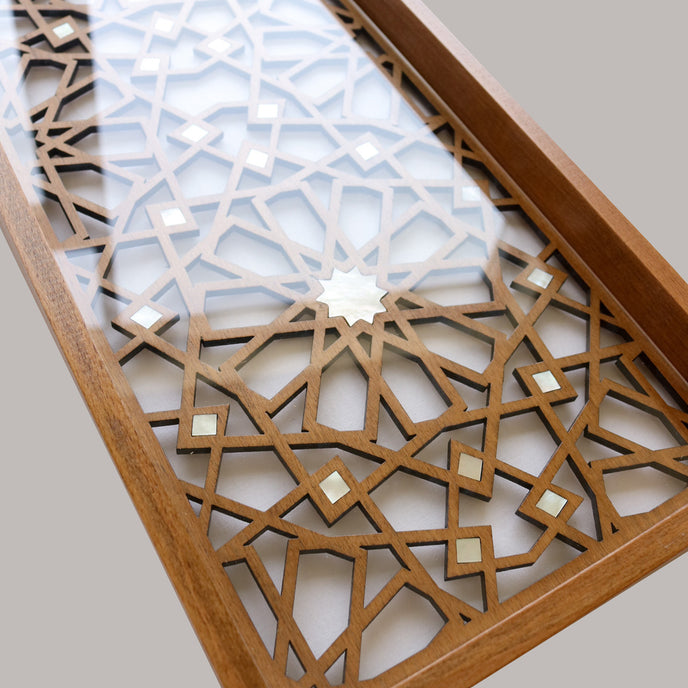 Crafted from high-quality wood, the Geometric Tray features a beautiful laser-cut design and elegant pearl inlay. Its removable Plexi layer makes cleaning effortless, adding to its functional and aesthetic appeal. Elevate any space with this versatile, sophisticated piece available in various sizes.
