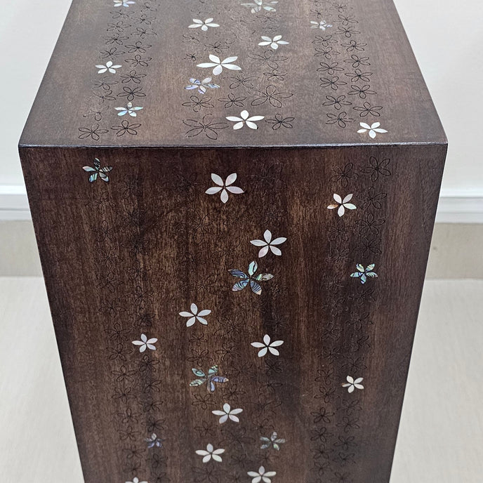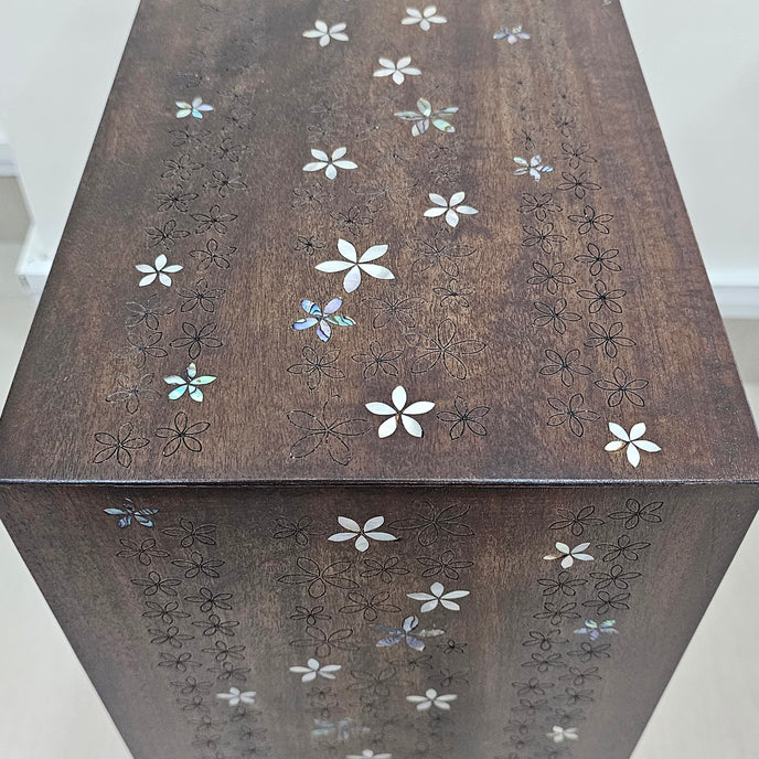 Expertly crafted with pearl inlay and wood, this sofa table features exquisite Jasmine flower designs that make it ideal for use as a side table or sofa table. Bring the wonders of nature into your home with this one-of-a-kind piece.