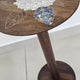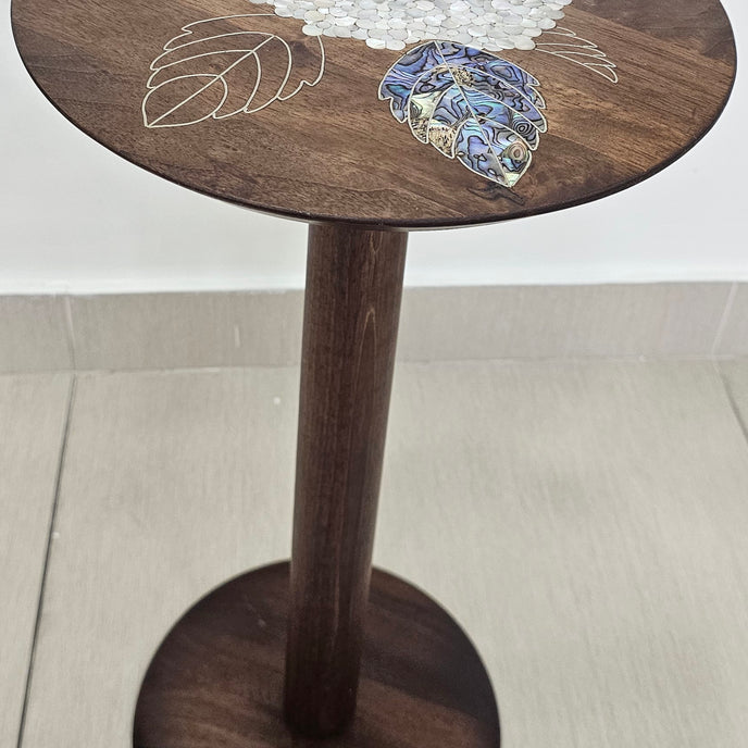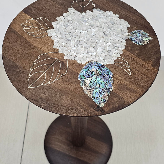 Hand-crafted pearl inlay and wooden stand create a stunning promegranate-shaped surface, perfect for use as a side table or sofa table. Experience the beauty of nature in your home with this unique piece.