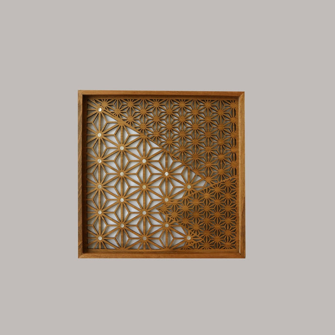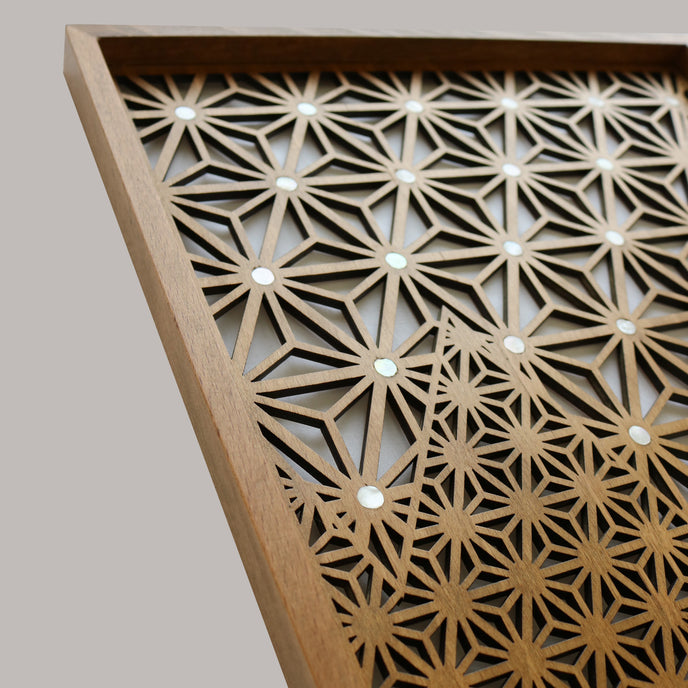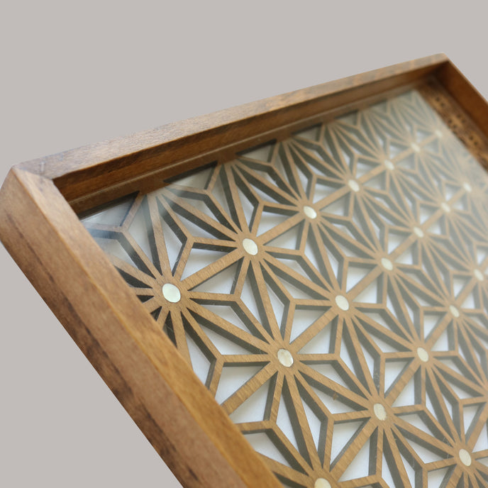 Crafted from high-quality wood, the Mix Tray features a beautiful laser-cut design and elegant pearl inlay. Its removable Plexi layer makes cleaning effortless, adding to its functional and aesthetic appeal. Elevate any space with this versatile, sophisticated piece in two sizes.