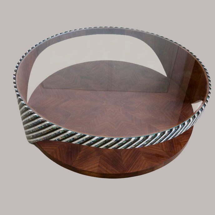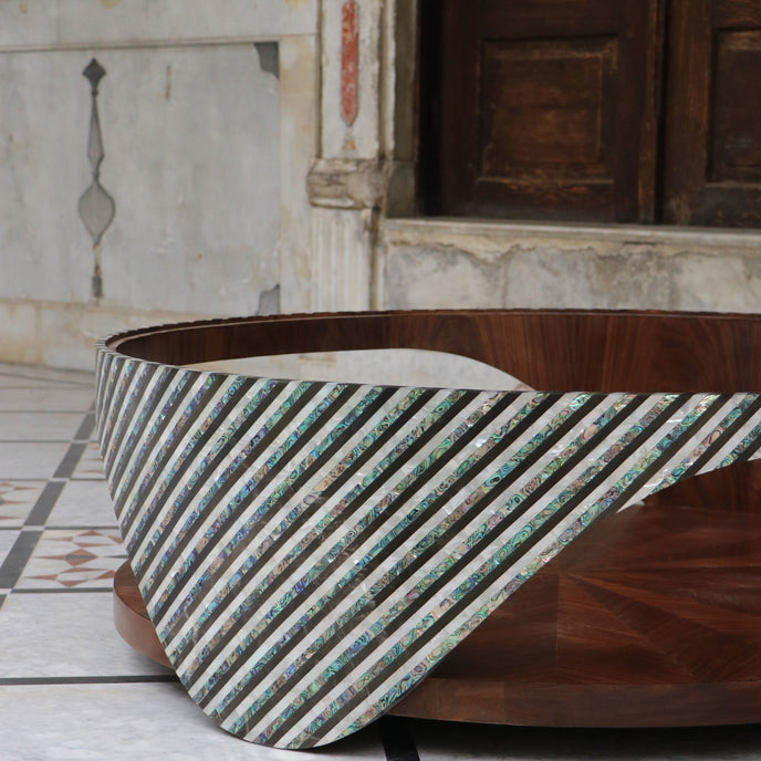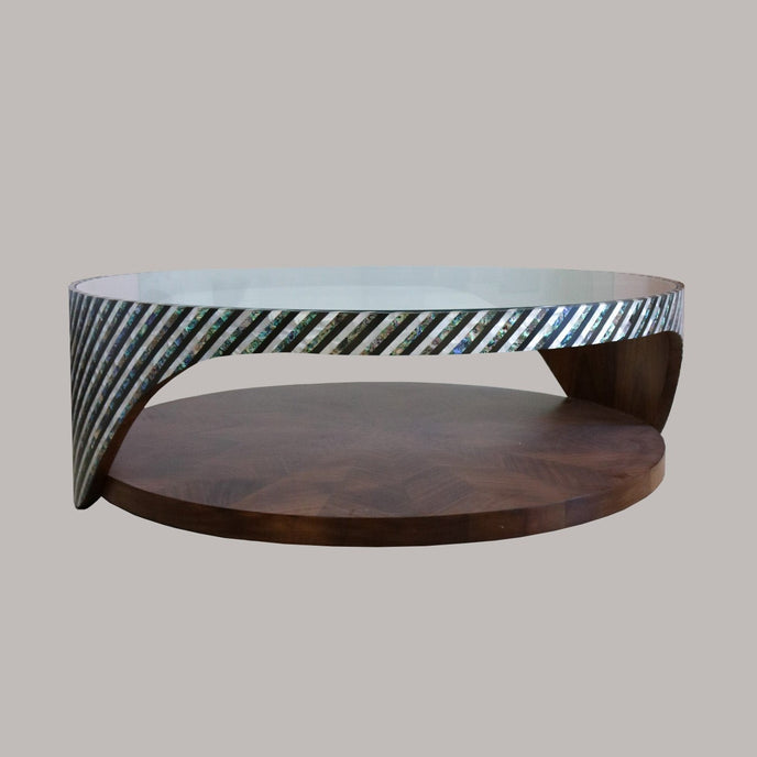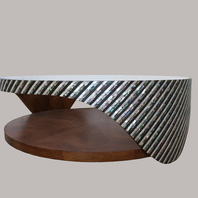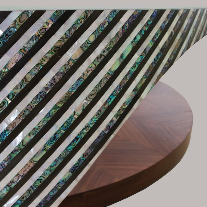 Experience the beauty of Mother Nature with The Wave Table. Handcrafted with mother of pearl and wood, this circular table pays homage to the natural flow of the ocean's waves. Its unique design and materials make it a stunning addition to any room. Elevate your space with The Wave Table.